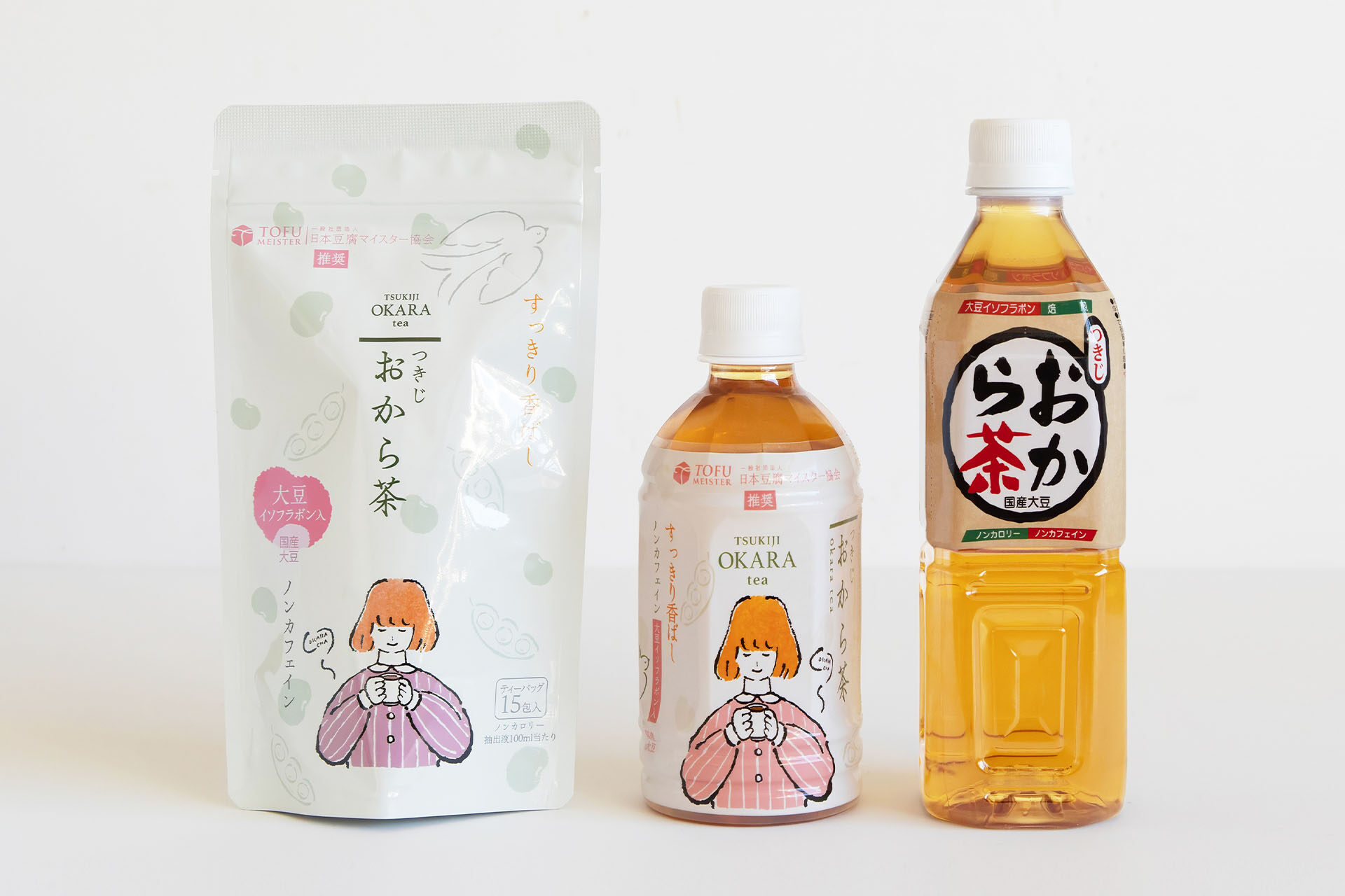 《つきじおから茶》は2種類のペットボトルとティーバッグの3タイプ。